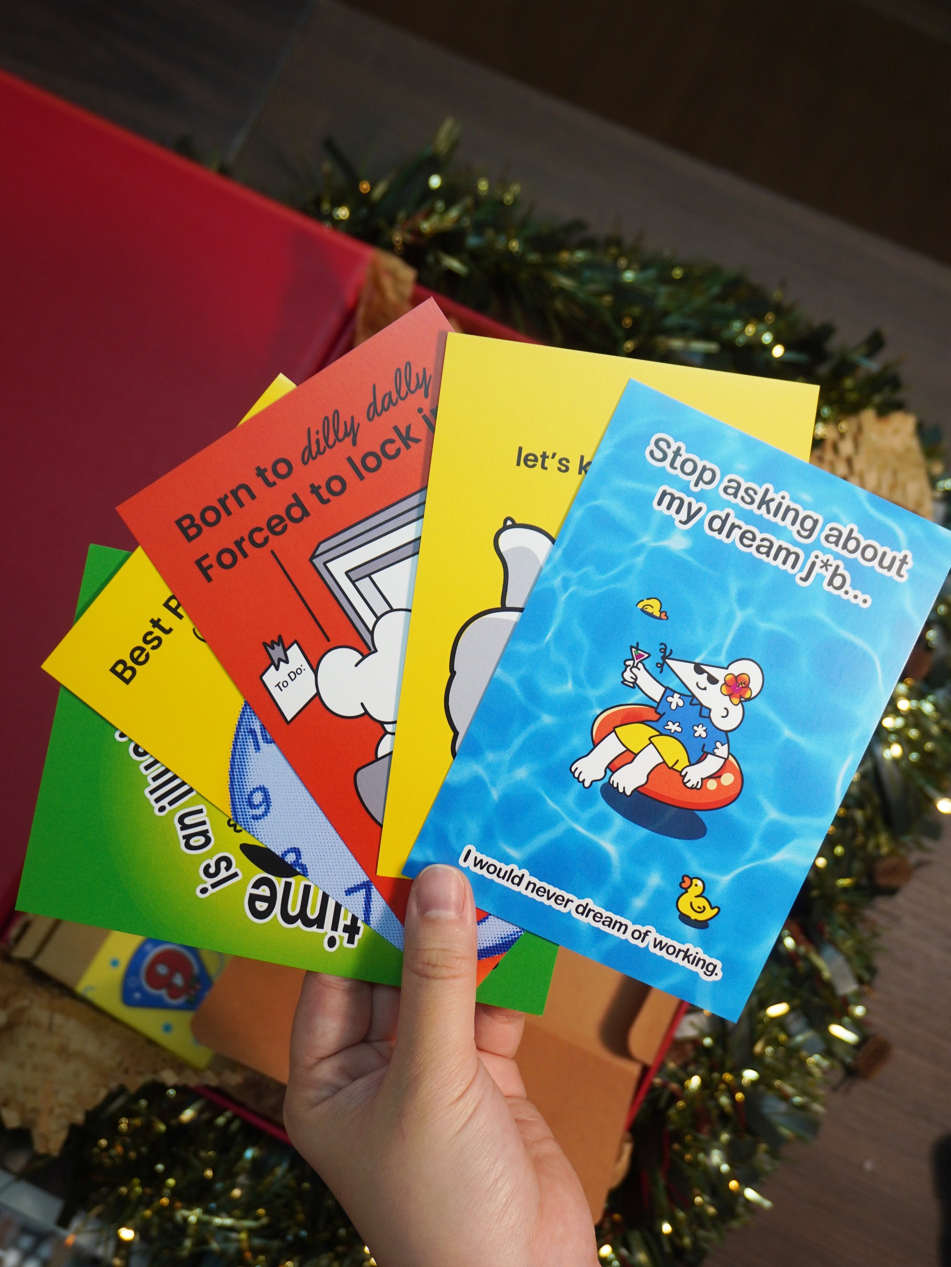 Chose from 7 different A6 postcard designs, perfect for gifting your equally jaded corporate bestie.